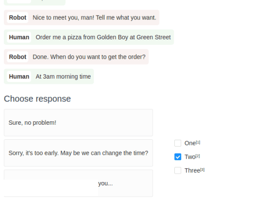 If you want to refine the best response for a conversational AI use case, you can provide already-generated responses to annotators and have them choose the best one.