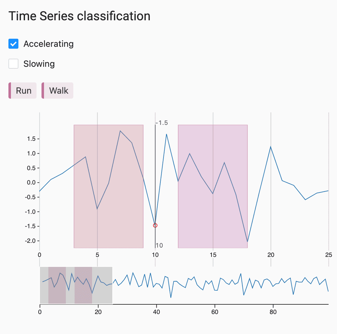 The TimeSeriesLabels control tag lets annotators classify specific regions of the time series graph as specific activities: